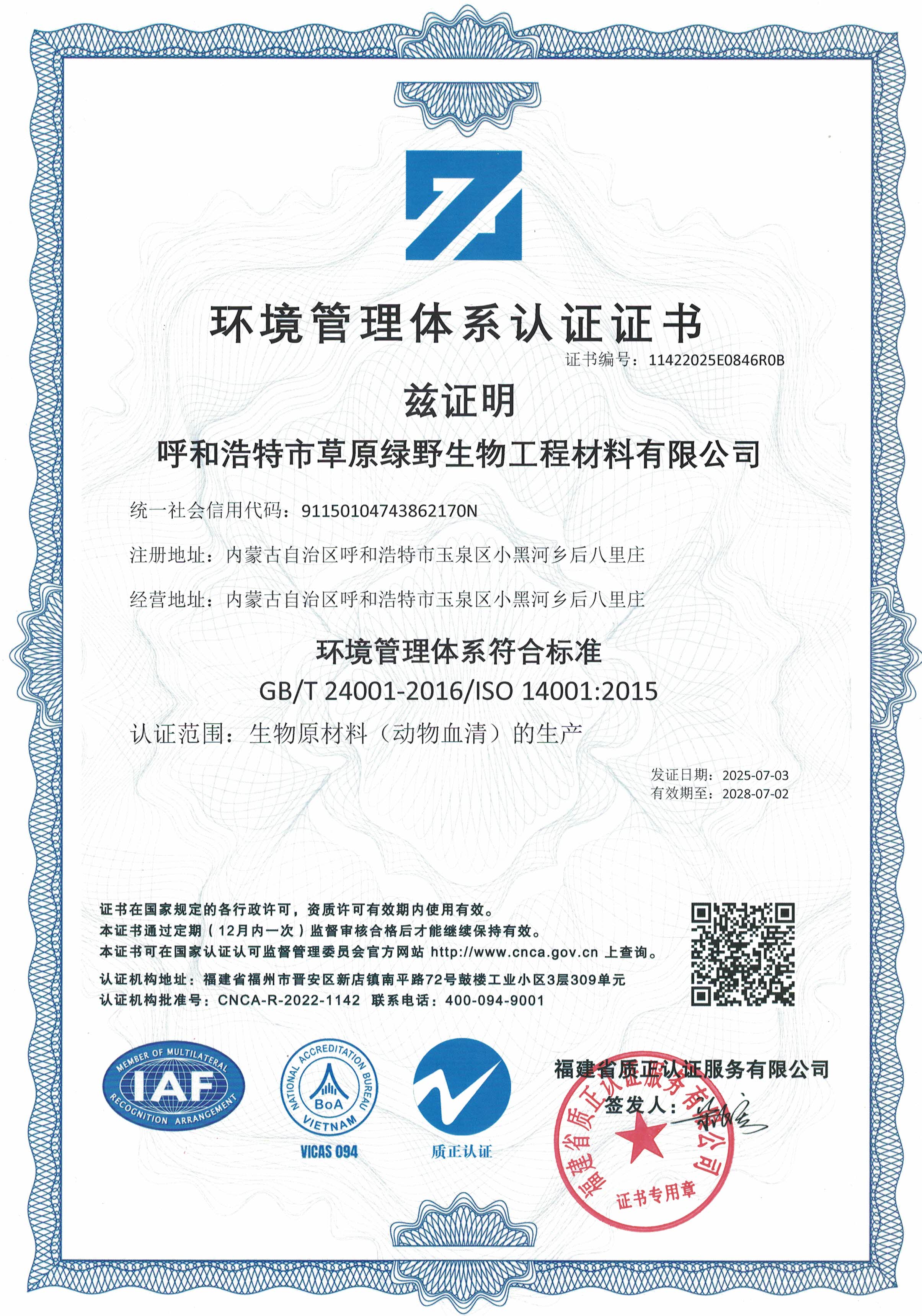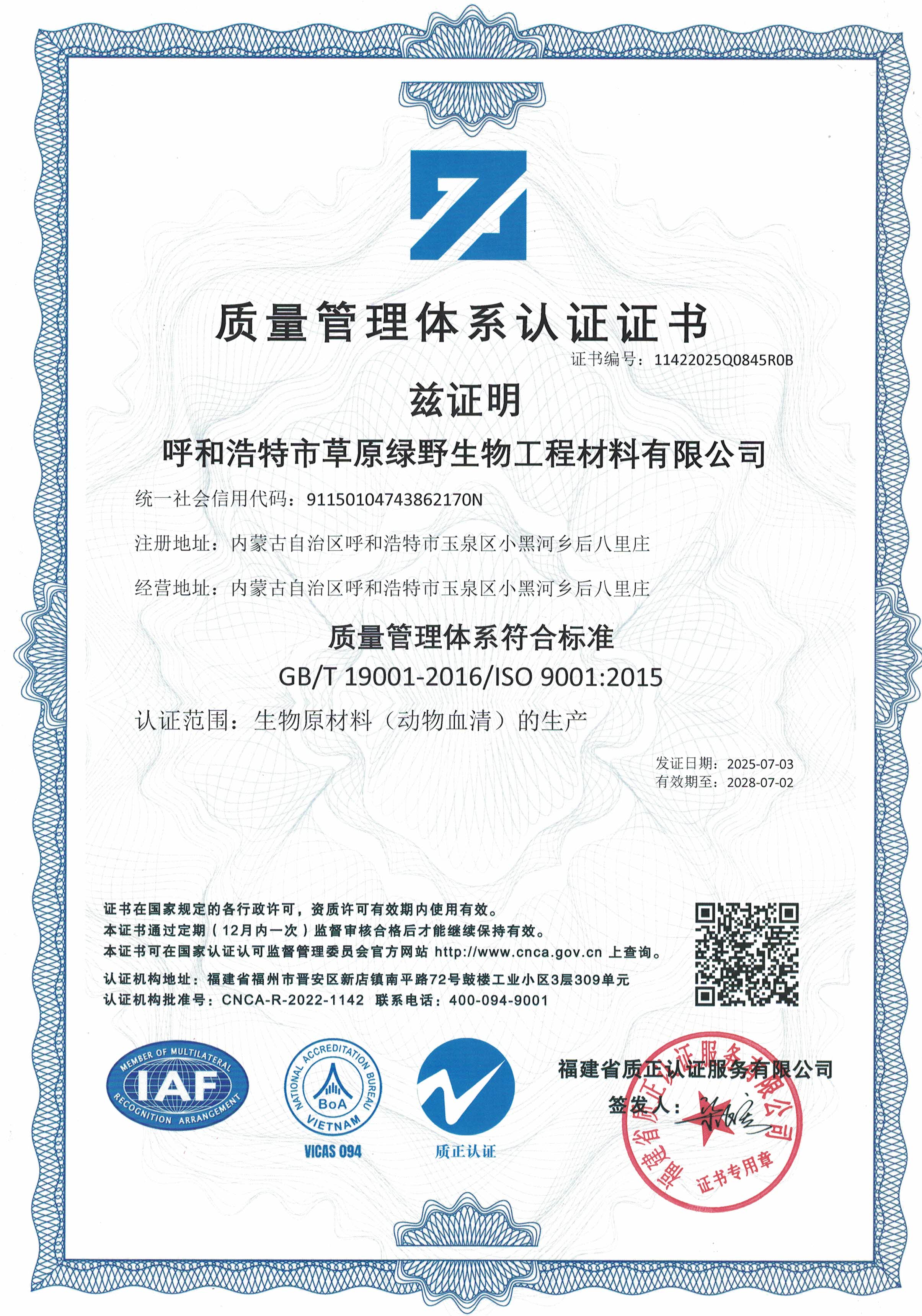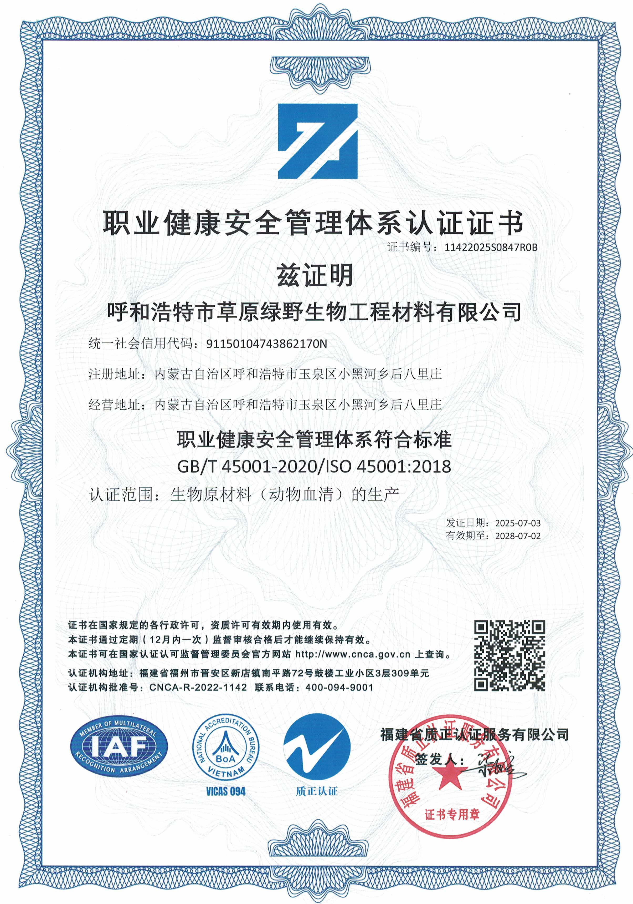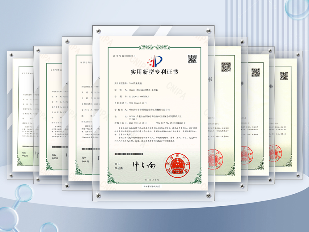 公司至今已多次通過中國醫(yī)藥生物技術協(xié)會《牛血清生產(chǎn)企業(yè)達標》認證、《牛血清生產(chǎn)質量達標企業(yè)》認證。ISO9001質量管理體系認證、ISO45001職業(yè)健康安全管理體系認證、ISO14001環(huán)境管理體系認證、ISO13485醫(yī)療器械質量管理體系認證、ISO50001能源管理體系認證、GB/T29490知識產(chǎn)權合規(guī)管理體系認證、AAA級信用企業(yè)認證、A級納稅單位評審等。